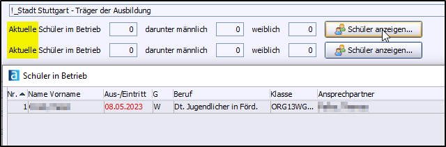 •Schüler im Betrieb: Die Anzahl der aktuellen Schüler, die im Betrieb eine Ausbildung bzw. ein Praktikum absolvieren. Ausbildungsverhältnisse werden im Modul Schüler über den Reiter Ausbildung eingetragen. Praktika können im Modul Schüler über den Reiter des aktuellen Schuljahres eingetragen werden.