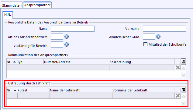 Die Lehrkraft, die Schüler während des Praktikums betreut, kann im Modul Betriebe auf dem Reiter Ansprechpartner in der Tabelle Betreuung durch Lehrkraft hinterlegt werden.