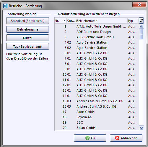 Per Drag & Drop können Betriebe auch manuell sortiert werden. Dazu markieren Sie einen Betrieb in der Spalte Nr. und verschieben ihn mit gedrückter linker Maustaste an die gewünschte Stelle.