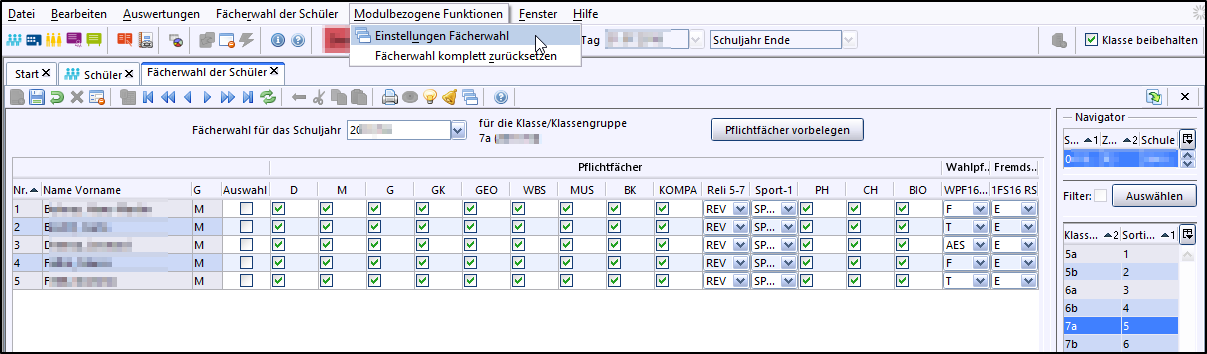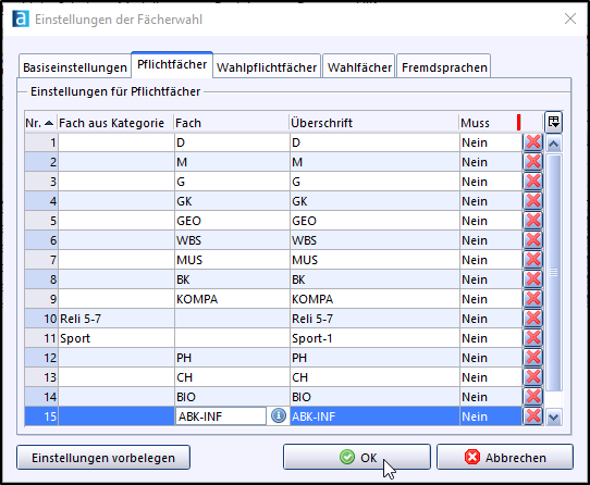 Dazu passen Sie die Auswahl der Fächer an und geben an, welches Fach in welcher Klassenstufe mit wievielen Stunden unterrichtet wird.