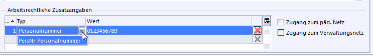 Die Auswahlliste Typ entspricht der in ASV hinterlegten Werteliste Personenzusatz und kann vom Schuladministrator geändert oder erweitert werden. Hinweise, wie Sie dabei vorgehen, finden Sie unter Administrator: Wertelisten der Hoheitsstufe S. |