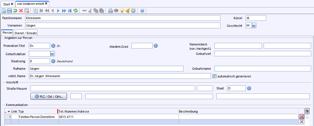 In den Eingabefelder für Anrede generieren Sie eine Briefvorlage. >Geben Sie z. B. den Text Sehr geehrte ein. >Klicken Sie anschließend auf Aktualisieren. Sie sehen nun die vervollständigte Briefanrede und die Briefanschrift. In den unteren beiden Tabellen können Angaben zur Kommunikation ergänzt werden.