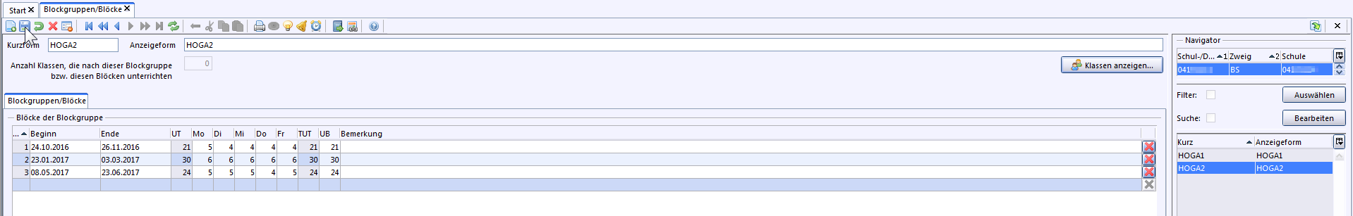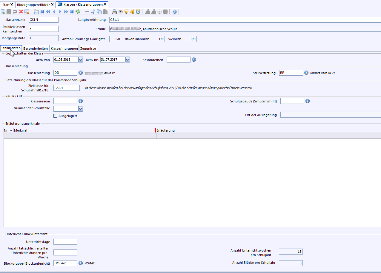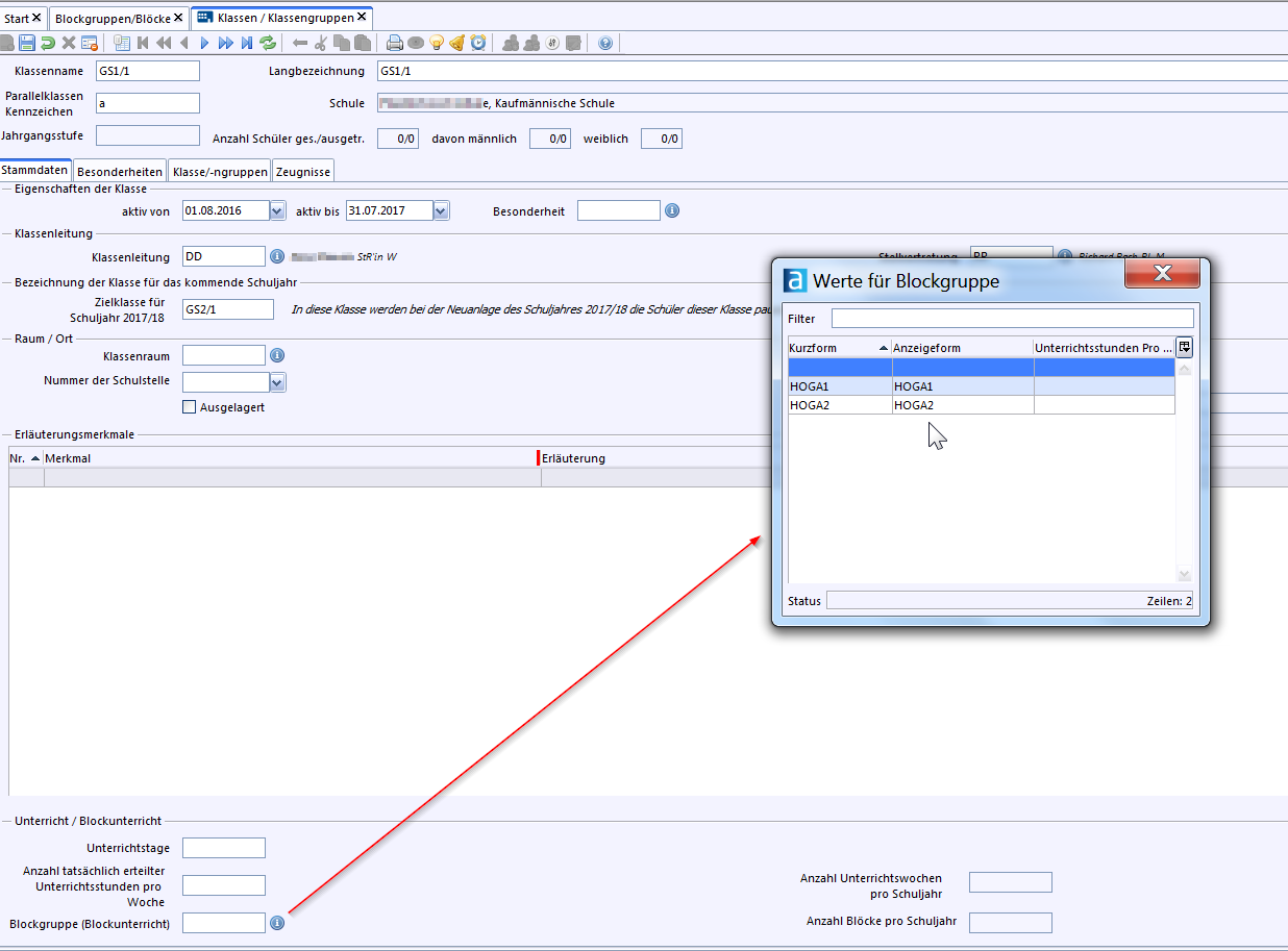 Nach Auswahl der Blockgruppe erscheinen die Daten bei den Stammdaten der Klasse.