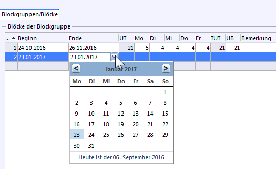 Da alle Schüler einer Klasse in den gleichen Wochen Unterricht haben, können für die jeweilige Klasse die Werte für Blockgruppe über die Schaltfläche ausgewählt werden.