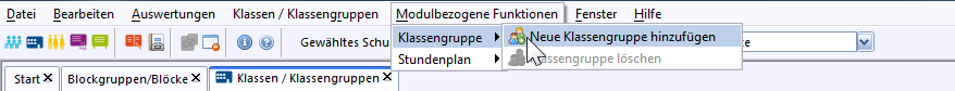 Sind in einer Klasse Schüler mit unterschiedlichen Ausbildungsberufen, können dafür verschiedene Klassengruppen angelegt werden ( oder Modulbezogene Funktionen: Klassengruppe Neue Klassengruppehinzufügen).
