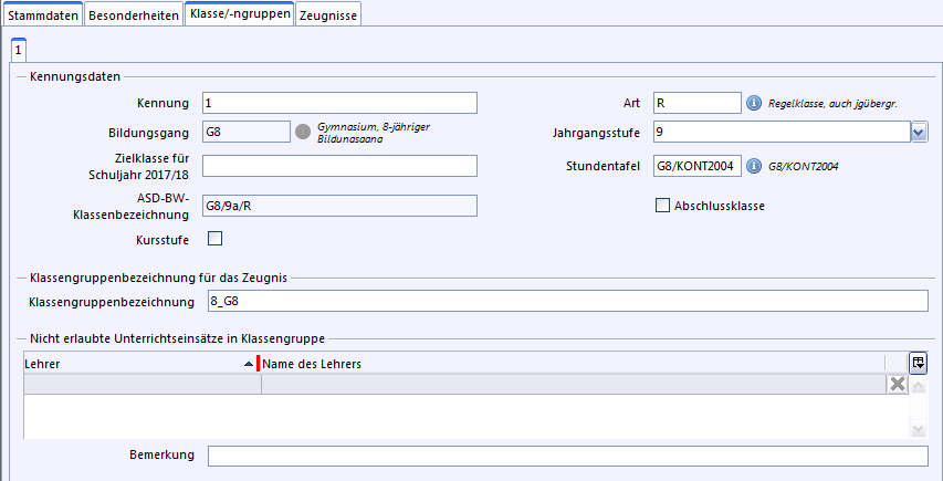 •Jahrgangsstufe: wenn verschiedene Jahrgangsstufen in einer Klasse unterrichtet werden, kann man pro Jahrgangsstufe eine Klassengruppe anlegen