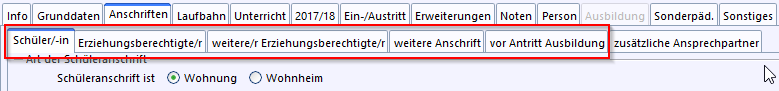 In ASV-BW können mehrere Anschriften zu jedem Schüler erfasst werden: 1.Die Hauptanschrift unter dem Unterreiter Schüler/in. 1.Die Anschriften der Erziehungsberechtigten 2.Eine weitere Anschrifte 3.Die Anschrift vor Antritt Ausbildung.