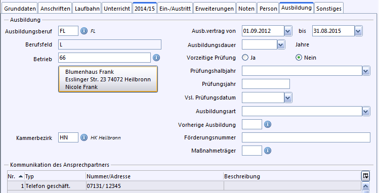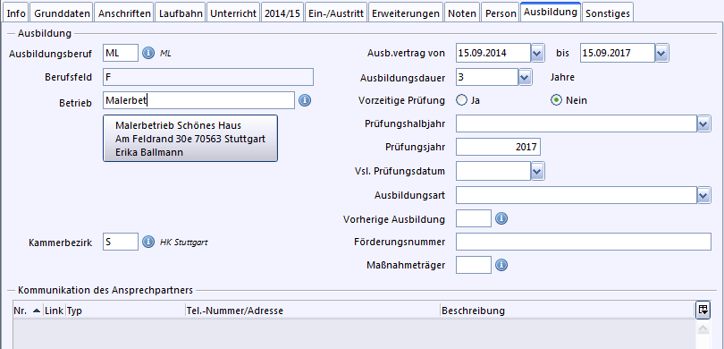 Für Schüler des dualen Systems können in ASV-BW im Modul Schüler unter dem Reiter Ausbildung die notwendigen Informationen hinterlegt werden. Ausbildungsberuf Den Ausbildungsberuf eines Schülers erfassen oder ändern Sie im Modul Schüler unter dem Reiter Ausbildung. Im Feld Ausbildungsberuf kann der Beruf aus der Werteliste ausgewählt werden. Das Feld Berufsfeld wird dann automatisch mit dem entsprechenden Wert gefüllt. Hat der Schüler bereits eine abgeschlossene Ausbildung kann dies im Feld Vorherige Ausbildung erfasst werden. Ausbildungsbetrieb Den Ausbildungsbetrieb eines Schülers erfassen oder ändern Sie im Modul Schüler unter dem Reiter Ausbildung. Durch Anklicken der Schaltfläche Nachdem ein Betrieb bzw. Ansprechpartner ausgewählt wurde, befindet sich unter dem Reiter Ausbildung unter dem Feld Betrieb eine Schaltfläche mit folgenden Informationen: •Name des Betriebs •Adresse des Betriebs •Name des Ansprechpartners •Kommunikationsdaten (Telefon und Email) des Ansprechpartners Durch Anklicken dieser Schaltfläche gelangen Sie ins Modul Betriebe auf den Reiter Stammdaten des entsprechenden Betriebs. Hinweis: Die Kommunikationsdaten, die im Modul Betriebe unter dem Reiter Ansprechpartner eingetragen wurden, werden unter dem Reiter Ausbildung im Bereich Kommunikation des Ansprechpartners angezeigt. Kammerbezirk Im Feld Kammerbezirk unter dem Reiter Ausbildung im Modul Schüler kann durch einen Klick auf die Schaltfläche Ausbildungsvertrag/-dauer Die Zeitspanne des Arbeitsvertrags sowie die Ausbildungsdauer können unter dem Reiter Ausbildung im Modul Schüler erfasst werden. Besucht ein Schüler ohne Ausbildungsvertrag die Schule, kann dies im Feld Ausbildungsart hinterlegt werden. Daten zur Prüfung Unter dem Reiter Ausbildung im Modul Schüler können Sie folgende Daten zur Ausbildungsabschlussprüfung erfassen: •Macht der Schüler eine vorzeitige Prüfung wählen Sie im Feld Vorzeitige Prüfung die entsprechende Optionsschaltfläche.