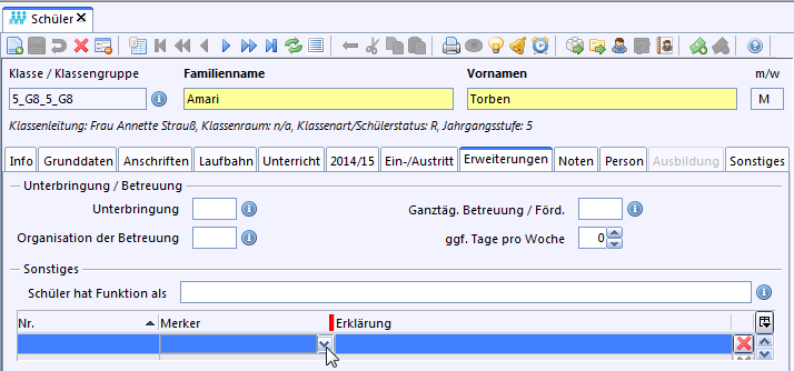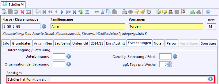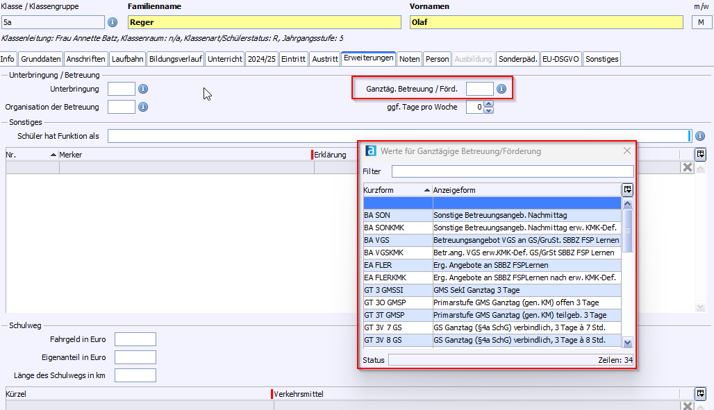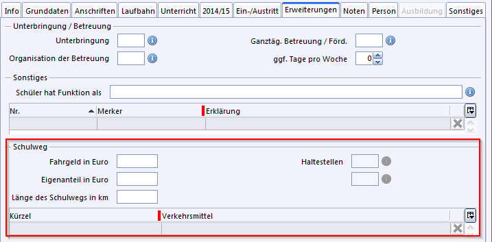 Klassensprecher / Schulsprecher Engagiert sich der Schüler z. B. als Klassensprecher, wird dies unter dem Reiter Erweiterungen im Modul Schüler gepflegt. Die im Feld Schüler hat Funktion als hinterlegte Werteliste kann von der Schule selbst im Modul Wertelisten (Werteliste Schülerfunktion) erweitert und gepflegt werden. Weitere Merkmale Möchten Sie weitere Merkmale oder Aktivitäten einzelner Schüler erfassen (z. B. welches Musikinstrument er in der Schulband spielt), können Sie dies mit Merkern erfassen. Merker müssen zunächst im Modul Wertelisten hinterlegt werden (Werteliste Merker, Hoheit S). Hinweis 1: Es ist leicht mit Filtern (z.B. zz Merker) auf das Feld Merker zuzugreifen und so Schüler zu selektieren. Hinweis 2: Weil es beliebig viele Merker geben könnte, sind sie für die Druckausgabe, z.B. in Listen, nur bedingt geeignet. Hinweis 3: Um zusätzliche Informationen für eine große Anzahl von Schülern zu hinterlegen, sind eher die Datenfelder (unter Sonstiges) geeignet. Folgende Daten zum Schulweg des Schülers können unter dem Reiter Erweiterungen im Modul Schüler erfasst werden: •Fahrgeld •Eigenanteil am Fahrgeld •Länge des Schulwegs •Haltestelle: Den Feldern Haltestelle ist eine Werteliste hinterlegt, die von der Schule selbst im Modul Wertelisten (Werteliste Haltestelle) erweitert und gepflegt werden kann. •Benutztes Verkehrsmittel: Damit Sie in der Spalte Verkehrsmittel einen Wert auswählen können, müssen zuvor im Modul Verkehrsmittel entsprechende Möglichkeiten erfasst worden sein. Nachmittagsbefreiung Ist ein Schüler vom Nachmittagsunterricht befreit, können Sie unter dem Reiter Erweiterungen im Modul Schüler zwei Tage erfassen. Unterbringung / Betreuung Eine zusätzliche Unterbringung bzw. Betreuung (z. B. Hausaufgabenbetreuung) des Schülers werden unter dem Reiter Erweiterungen im Modul Schüler gepflegt. Dazu werden die entsprechenden Felder ausgefüllt. Die Wahl der Betreuungsorganisation erfolgt über eine Werteliste. Die Werteliste Betreuung Organisation (Hoheit S) kann von der Schule selbst im Modul Wertelisten erweitert und gepflegt werden. Ganztägige Betreuung / Förderung (GTS) Die für Ihre Schule festgelegte Form der Ganztagsbetreuung kann hier erfasst werden.