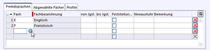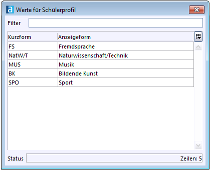 Im unteren Teil können manuell Daten zur Grundschulempfehlung eingetragen werden. Die von einem Schüler in seiner Laufbahn bisher besuchten Fremdsprachen können unter dem Reiter Laufbahn unter dem Unterreiter Fremdsprachen erfasst und gepflegt werden. Bitte beachten Sie, dass dabei kein Unterricht erzeugt wird. Belegt der Schüler im laufenden Schuljahr die Fremdsprache, ist dies bei der Fächerwahl der Schüler unter dem Reiter Fremdsprachen anzuhaken. Der Eintrag dort erzeugt beim Schüler unter dem Reiter Unterricht einen statistisch relevanten Eintrag und wird überdies unter dem Reiter Fremdsprachen beim Schüler mit Fach und Fachbezeichnung hinterlegt. Bitte beachten Sie, dass im Modul nur die Auswahl von Fächern einer Fachkategorie (1. FS, 2. FS) möglich ist, die Sie an das Angebot Ihrer Schule anpassen können. Sobald in der Spalte Fach die Fremdsprache aus der Werteliste ausgewählt wurde, wird in die Spalte Fach die Abkürzung und in die Spalte Fachbezeichnung die Langbezeichnung der Fremdsprache eingetragen. Dieser Eintrag wird über die Fächerwahl automatisch generiert. Wollen Sie eine Fremdsprache eintragen, die nicht in der Werteliste enthalten ist, wählen Sie bitte Sonstige Fremdsprache aus. In den Spalten von bzw. bis Jgst (Jahrgangsstufe) wählen Sie die entsprechenden Werte aus der Werteliste aus. Wurde eine Feststellungsprüfung abgelegt, kann dies in der Spalte Feststellungspr. durch Aktivierung des Kontrollfeldes hinterlegt werden. Möchten Sie dazu einen Freitext, z. B. den Namen der Sonstigen Fremdsprache erfassen, können Sie dies in der Spalte Bemerkung tun. Die Niveaustufe der Fremdsprache wird in der entsprechenden Spalte erfasst. Alternativ können Sie diese Felder per Sammeländerung für Schülergruppen oder ganze Klassen durchführen. Abgewählte Fächer siehe Kapitel Vorgänge - Abgewählte Fächer. Das am Gymnasium belegte Profil wird im Modul Schüler unter dem Unterreiter Laufbahn hinterlegt. Folgende Werteliste ist z. B. bei einem allgemeinbildenden Gymnasium hinterlegt: |