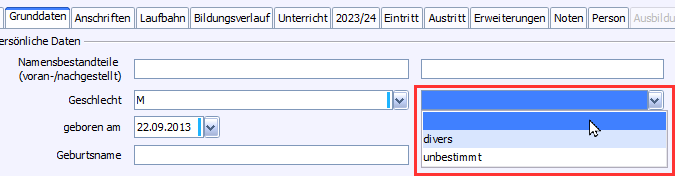 Das Datenfeld Rufname wird bei der Eingabe der Vornamen automatisch mit dem ersten Vornamen gefüllt. Es kann aber angepasst werden. Namensbestandteile Geschlecht Bei Bedarf kann zusätzlich im Feld Geschlecht erweitert zwischen den Werten divers und unbestimmt gewählt werden. Hinweis: Geburtsland, Verkehrssprache Staatsangehörigkeit Anredetext