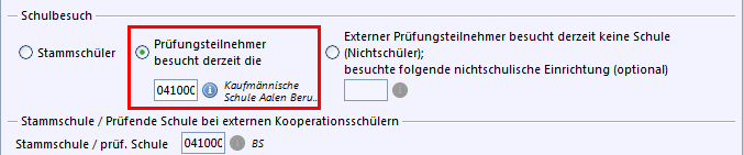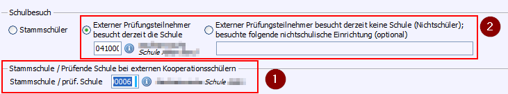 Zuzug aus dem Ausland Als Kooperationsschüler sind hier Stammschüler der Kursstufe eines anderen allgemein bildenden Gymnasiums oder eines anderen beruflichen Gymnasiums gemeint, die an einem Kurs der eigenen Schule teilnehmen. Tragen Sie in diesem Fall im Feld Stammschule/Prüfende Schule bei externen Kooperationsschülern (1) im Modul Schüler unter dem Reiter Grunddaten die fremde Stammschule der Schüler ein. Zusätzlich muss dann noch zwingend eines der beiden Felder Externer Prüfungsteilnehmer besucht derzeit die Schule oder Externer Prüfungsteilnehmer besucht derzeit keine Schule (2) markiert werden. Über die Für UPM müssen die Kooperationsschüler außerdem zwingend in einer Klasse mit der Klassenart KOOP geführt werden. Externer Prüfungsteilnehmer / Schulfremdenprüfung Kooperative Organisationsformen Bitte beachten Sie, dass Schüler in Kooperativen Organisationsformen des gemeinsamen Unterrichts (früher: Außenklassen, statistisch am SBBZ zählend) an der allgemeinen Kooperationsschule ebenfalls gesondert gekennzeichnet werden müssen, damit sie für die ESS korrekt abgebildet werden. Kennzeichnen Sie diese Schüler durch Markieren des Feldes Externer Prüfungsteilnehmer besucht derzeit die Schule. Tragen Sie dort auch die Stammschule (das abgebende SBBZ) ein. Alternativ können die Schüler eines SBBZ auch in einer Klasse mit der Klassenart KOPSCH geführt werden. Beachten Sie dazu die entsprechenden Hinweise im Abschnitt Kooperative Organisationsformen. |
