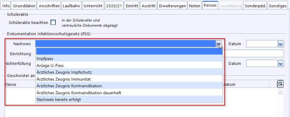 Dokumentation Infektionsschutzgesetz (IfSG) Aus datenschutzrechtlichen Gründen ist die Verarbeitung besonders sensibler Daten, zu denen Gesundheitsdaten zählen, grundsätzlich untersagt. Eine Erfassung des Impfstatus hinsichtlich Covid-19 ist daher in ASV nicht möglich. Bei Schülern kann unter dem Reiter Person allerdings der Nachweis zur Masernschutzimpfung erfasst werden, für die eine Impfpflicht besteht. Unter Nachweis wählen Sie aus, in welcher Form der Nachweis vorgelegt wurde. Als Datum wählen Sie das Datum, an dem der Nachweis an der Schule vorgelegt wurde. Sofern Sie unter Nachweis den Eintrag „Nachweis bereits erfolgt“ ausgewählt haben, erfassen Sie in dem Feld Einrichtung die staatliche Stelle oder Leitung einer anderen Einrichtung im Sinne von §20 Absatz 8 Satz 1 IfSG, der der Nachweis bereits vorgelegt wurde. Liegt kein Nachweis vor, so dokumentieren Sie dieses mit dem Feld Nichterfüllung und ergänzen ggf. das Datum. Die hier erfassten Einträge können Sie über die Berichte zz IfSG Einzelnachweis sowie zz Schülerliste zz Schülerliste IfSG Dokumentation ausgeben.