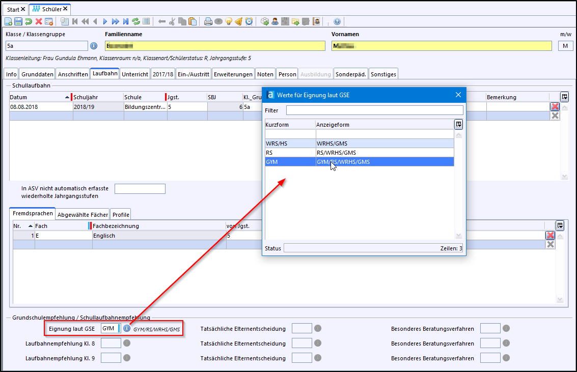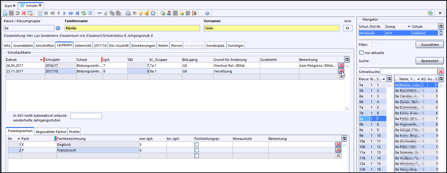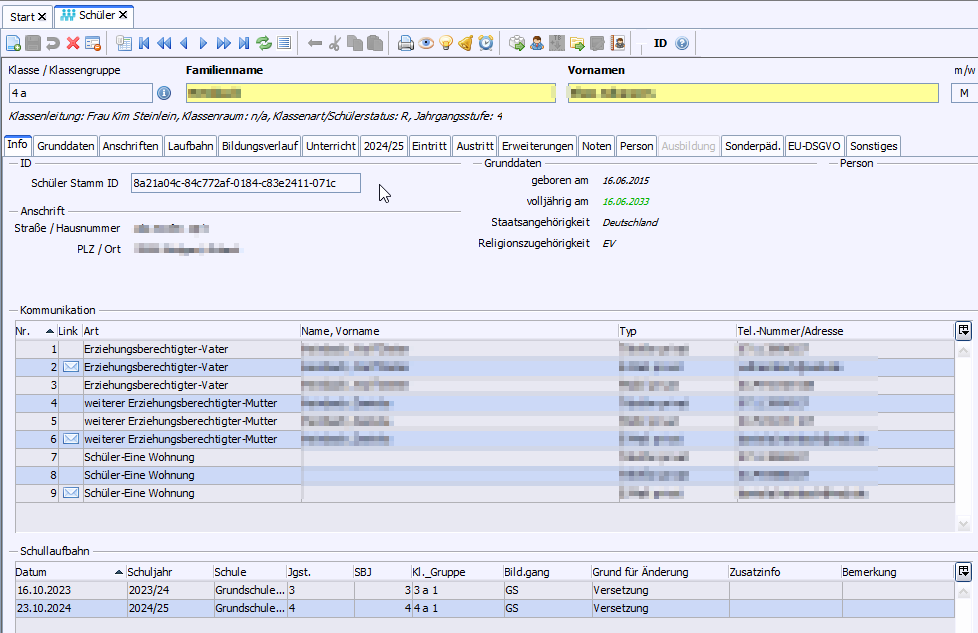 Die Laufbahndaten eines Schülers können unter dem Reiter Laufbahn im Modul Schüler angesehen werden.