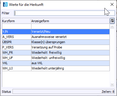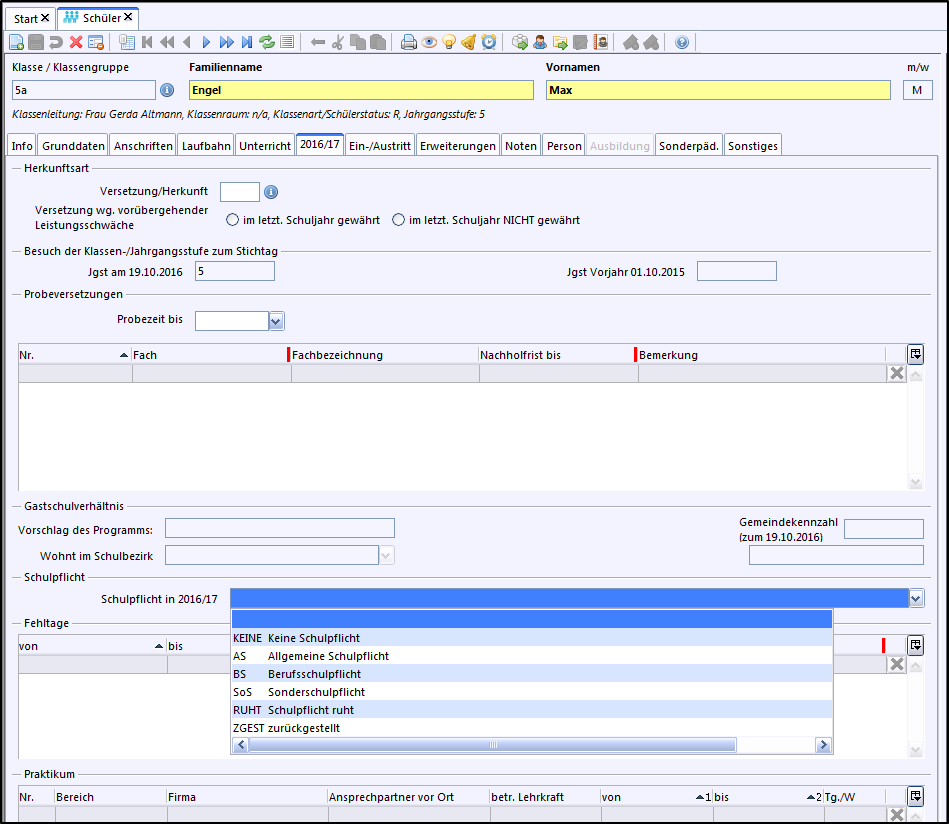 Herkunft Im Feld Herkunft wird erfasst, auf welchem Weg der Schüler in die Klasse gelangt ist. Klassenziel am Ende des Schuljahres Das Feld wird automatisch mit ERR (erreicht) befüllt, wenn bei der Klassengruppenweisen Zeugnisdatenerfassung beim Jahres- bzw. Abschlusszeugnis die Option versetzt bzw. bestanden oder erfolgreich angehakt wird. Wenn Schüler probeweise in die kommende Klassenstufe versetzt werden, ist der Wert NERR-PRAIP - probeweise [in die nächste Klassenstufe] aufgenommen, in Probezeit - zu wählen. Dieser Wert kann nachträglich abgeändert werden, wenn der Versetzungsentscheid feststeht. Entsprechend kennzeichnet ERR-PRAAV probeweise [in die nächste Klassenstufe] aufgenommen, anschließend versetzt, bzw. NERR-PRANV probeweise [in die nächste Klassenstufe] aufgenommen, anschließend nicht versetzt. Schüler, die unterjährig die Schule verlassen und hierbei den Bildungsgang nicht bis zum Ende besuchen , erhalten im Feld Klassenziel am Ende des Schuljahres den Wert VA – Vorzeitiger Abbruch. Dies trifft beispielsweise bei Umzug oder einem sonstigen Schulwechsel zu. Sie können in ASV-BW im Modul Schüler unter dem Reiter Schuljahr unten Praktika des Schülers erfassen. Dazu wählen Sie in der Spalte Bereich den Praktikumsbetrieb aus. Die Werteliste der Spalte Bereich enthält alle im Modul Betriebe angelegte Betriebe (Ausbildungs- und Praktikumsbetriebe). Die Spalten Firma und Ansprechpartner vor Ort werden automatisch gefüllt. Die restlichen Spalten sind für Ihre Eingaben vorgesehen. Sie können in ASV-BW im Modul Schüler unter dem Reiter Schuljahr Fehltage des Schülers erfassen. Nachdem Sie die Spalten von und bis der Tabelle Fehltage ausgefüllt haben, berechnet ASV-BW die Anzahl der Kalendertage und die der Schultage, an denen der Schüler gefehlt hat. Die Wahl der Art und des Grundes für das Fehlen erfolgt jeweils über eine Werteliste. Diese Wertelisten können von der Schule selbst im Modul Wertelisten (Werteliste Fehltageart bzw. Fehltag Grund) erweitert und gepflegt werden. Schulpflicht Sie können im Modul Schüler unter dem Reiter Schuljahr erfassen, welcher Schulpflicht (z. B. allgemeine Schulpflicht, Berufsschulpflicht etc.) der Schüler unterliegt. |