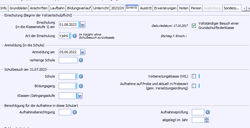 Unter dem Reiter Eintritt wird das Einschulungsdatum vermerkt und es werden die Angaben zu vorherigen Schulbesuchen verwaltet. Der Eintritt in die Schule (bzw. den aktuellen Bildungsgang) wird nicht hier, sondern unter dem Reiter Bildungsverlauf eingetragen.