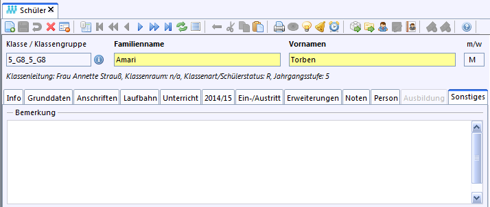 Bemerkungen In ASV-BW haben Sie im Modul Schüler unter dem Reiter Sonstiges die Möglichkeit eigene Bemerkungen zum Schüler zu erfassen.