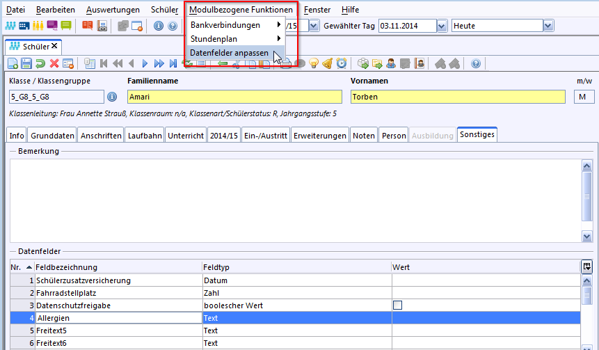 Beachten Sie bitte Folgendes: •Um Ihnen Flexibilität zu ermöglichen, können Feldbezeichnung und Feldtyp geändert werden. •Änderungen übertragen sich dann jedoch auf alle Schüler und in allen ASV-Schuljahren! •Feldbezeichnung und Feldtyp sollten also nachträglich nur dann geändert werden, wenn die Informationen der vergangenen Schuljahre nicht mehr gebraucht werden.
