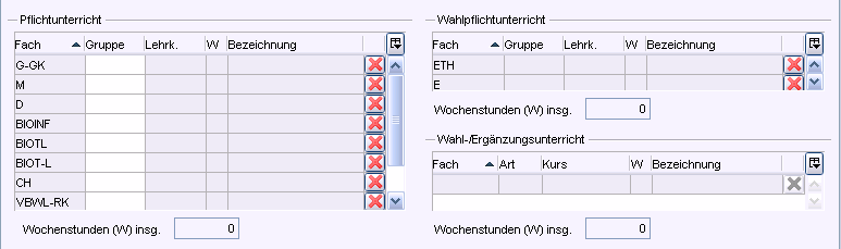 Der vom Schüler besuchte Unterricht, wird unter dem Reiter Unterricht im Modul Schüler abgebildet und kann teilweise dort gepflegt werden. Folgende Unterrichtsmerkmale können auf diesem Reiter gepflegt werden: •Teilnahme am Religionsunterricht im 1. bzw. 2. Halbjahr •Abmeldung vom Religionsunterricht •Sportbefreiung im 1. bzw. 2. Halbjahr •in welcher Gruppe eines Pflichtfachs der Schüler unterrichtet wird (z. B. Datenverarbeitung Gruppe 1 am Dienstag oder Gruppe 2 am Freitag) •zu welcher Art ein Wahl-/Ergänzungsfach gehört (z. B. Arbeitsgemeinschaft etc.) •Realschule Klasse 7-9: Hier kann die Niveaustufe (G oder M) des Schülers jeweils für das 1. und 2. Halbjahr eingetragen werden. •Realschule: Hier kann die Teilnahme am Mentorenprogramm vermerkt werden •GMS: Hier kann der Elternwunsch eingetragen werden, ob Noten auf dem Lernentwicklungsbericht ausgewiesen werden oder nicht. Alle anderen Felder sind reine Anzeigefelder, die auf diesem Reiter nicht verändert werden können. Die Fächer (Pflicht-, Wahlpflicht-, Wahl- bzw. Ergänzungsfächer), die ein Schüler belegt, werden im Modul Fächerwahl der Schüler dem Schüler zugewiesen. Unter jeder Tabelle werden in dem Feld Wochenstunden (W) insgesamt die Stunden des jeweiligen Unterrichts an der im Navigator ausgewählten Schule angezeigt. Dabei ist zu beachten, dass Unterricht, der an einer anderen Schule erteilt wird, mit 0 Wochenstunden gezählt wird. In folgenden Spalte werden die im Modul Unterricht hinterlegten Daten angezeigt: •Lehrkraft in der Tabelle Pflicht- und Wahlpflichtunterricht •Bezeichnung in der Tabelle Pflicht-, Wahlpflicht-, Wahl- und Ergänzungsunterricht •W (Wochenstunden) in der Tabelle Pflicht-, Wahlpflicht-, Wahl- und Ergänzungsunterricht •Kurs in der Tabelle Wahl- und Ergänzungsunterricht In den Bereichen Unterrichtselement und Besuchtes Fach werden ebenfalls die im Modul Unterricht hinterlegten Daten angezeigt. Teilnahme / Nichtteilnahme am Religionsunterricht Dabei ist zu beachten, dass die beiden Felder Teilnahme am RU 1. Hj bzw. 2. HJ anhand der Konfession des Schülers, die unter dem Reiter Grunddaten erfasst wurde, vorbelegt werden. •Meldet sich der Schüler vom Religionsunterricht ab, so wird das Abmeldedatum im Feld Abmeldung vom Religionsunterricht am eingetragen. •Dieses Feld kann nur befüllt werden, wenn beim Schüler eine Konfession eingetragen ist. •Bitte beachten Sie, dass der eingetragene Abmeldetermin spätestens zwei Wochen nach jeweiligem Unterrichtsbeginn liegen muss. Sportbefreiung Zuweisung des Schülers zu einer Fachgruppe (Pflichtfachgruppe) Die Zuweisung erfolgt unter dem Reiter Unterricht im Modul Schüler in der Spalte Gruppe der Tabelle Pflichtunterricht. Nach Auswahl der entsprechenden Gruppe werden in den restlichen Spalten der Tabelle die im Modul Unterricht hinterlegten Daten angezeigt. Zuweisung der Art eines Wahl- bzw. Ergänzungsfachs Unterricht des Schülers, der an anderen Schulen stattfindet Dazu muss zunächst das Fach des Schülers ausgewählt werden, das an einer anderen Schule unterrichtet wird. Nach einem Klick auf die Schaltfläche anderer Schule zuordnen wird die entsprechende Schule aus der Werteliste ausgewählt. Nachdem die Schaltfläche OK angeklickt wurde, ändert sich: •die Anzeige der Wochenstunden in der Spalte W auf 0 Stunden •die Daten, die in den anderen Spalten angezeigt wurden, werden nicht mehr angezeigt Wird der Unterricht später an der eigenen Schule angeboten, wird der Vorgang durch einen Klick auf die Schaltfläche von anderer Schule zurückholen rückgängig gemacht. |