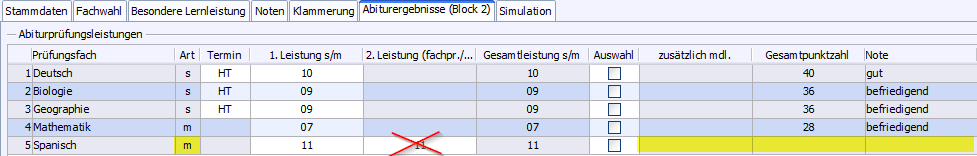 Nur wenn das Feld 2. Leistung bei den mündlich geprüften Fremdsprachen verordnungskonform leer bleibt, wird das Ergebnis korrekt weiterverarbeitet. Dies betrifft nicht Fächer wie z. B. Sport, welche auch bei mündlichen Prüfungen Teilleistungen vorsehen.
