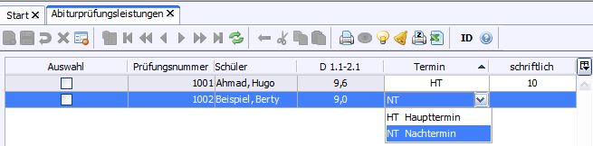 Der vom Programm vorbelegte Wert "HT" für "Haupttermin" kann dort oder auf dem Reiter Abiturergebnisse (Block 2) individuell pro Fach individuell über den DropDown-Pfeil gegen "NT" für "Nachtermin" ausgetauscht werden.