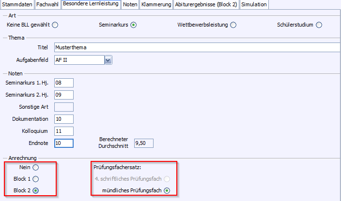Die Teilleistungen für die Besondere Lernleistung (BLL) können nur unter Kursstufe > Schülerdaten auf dem Reiter Besondere Lernleistung erfasst werden, nicht in der Sammelerfassung oder fachweisen Notenerfassung und auch nicht über NEO. Der Ausweis ist lt. BGVO nur in der Jahrgangsstufe 1 vorgesehen, im 1. Halbjahr wird die Bewertung des dreistündig belegten Seminarkurses ausgegeben.