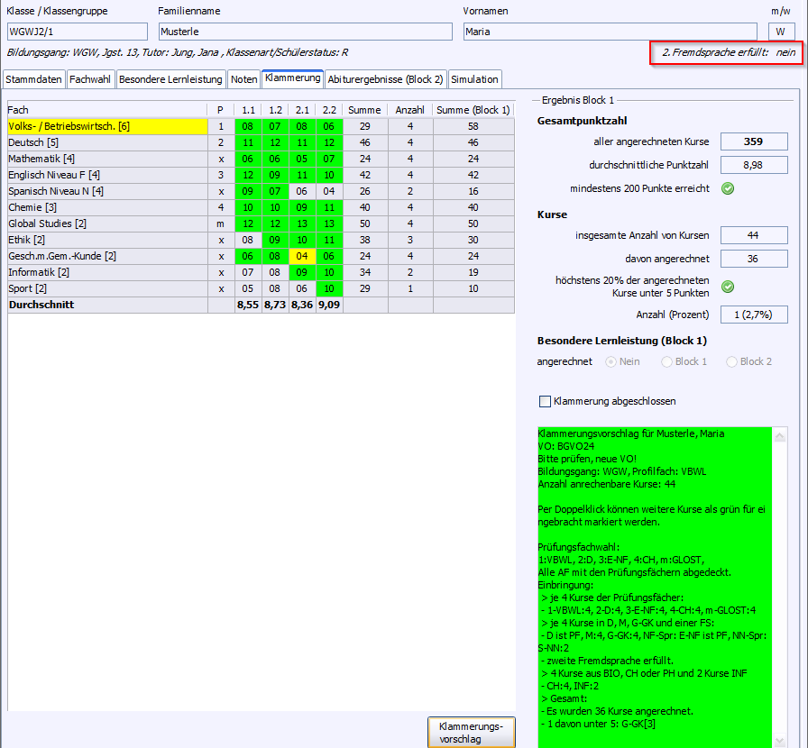 Datei: Kursstufe > Schülerdaten / Reiter: Klammerung Führen Sie den Klammerungsvorschlag über den Button unter der Notentabelle aus. Eine zusätzliche oder komplette manuelle Aus-/Abwahl ist hier für alle Fächer außer der BLL durch Doppelklick möglich (grün markiert = eingebracht; grau = geklammert bzw. nicht eingebracht). Nach finaler Prüfung sollte die Checkbox Klammerung abgeschlossen angehakt werden, damit die Noten nicht mehr an anderer Stelle geändert werden können.