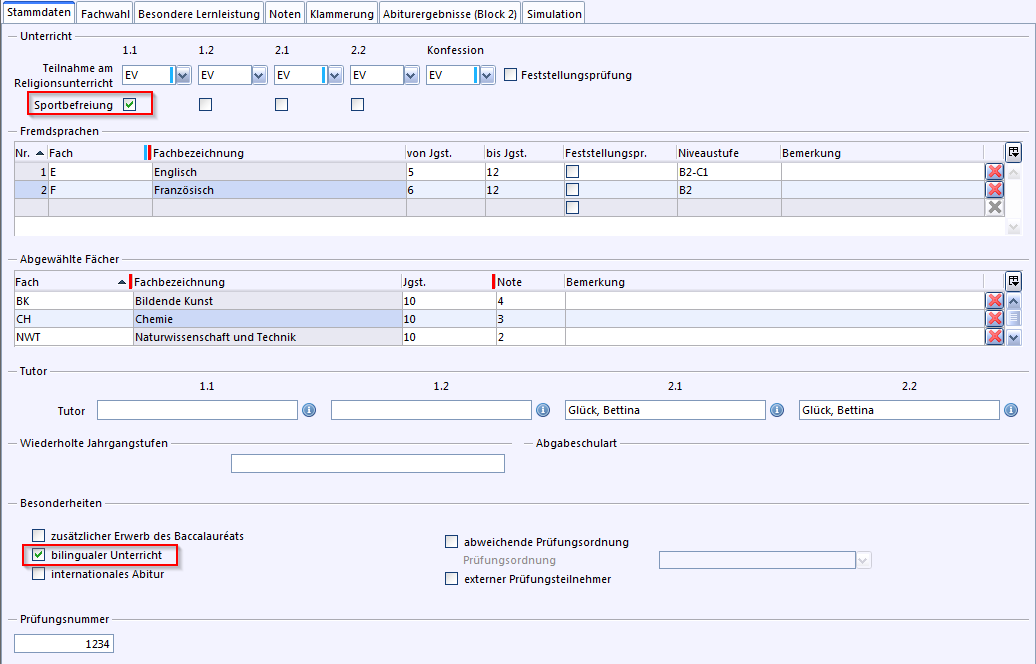 Auf dem Unterreiter Stammdatenwerden die Einträge bei Teilnahme am Religionsunterricht und Fremdsprachen anhand der Einträge in der allgemeinen Schülerpersonalkarte vorbelegt. In den Kursstufen-Schülerdaten gemachte Änderungen werden in diesen Bereich übertragen. Zusätzlich kann angehakt werden, dass der Schüler z.B. bilingual unterrichtet wird.