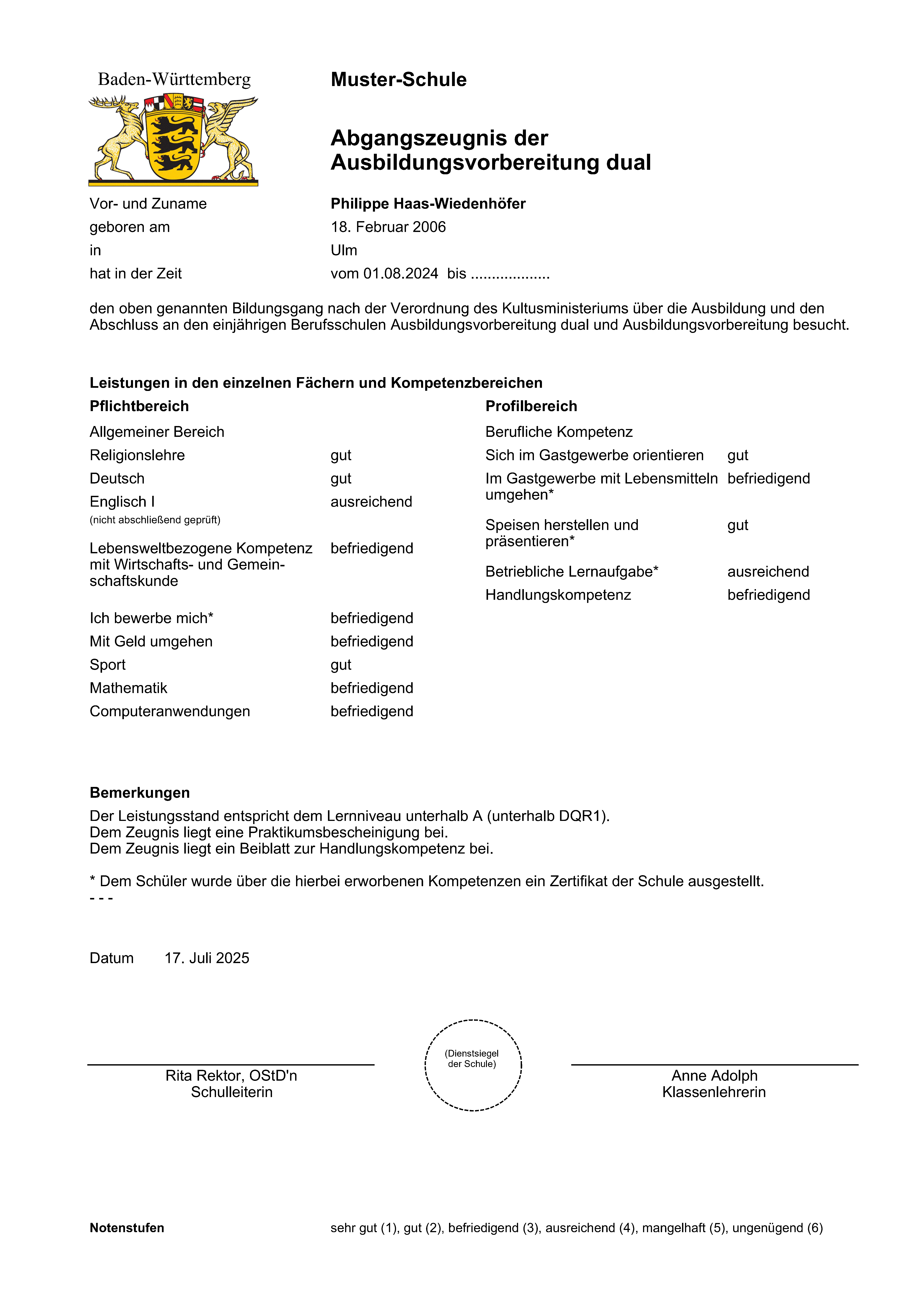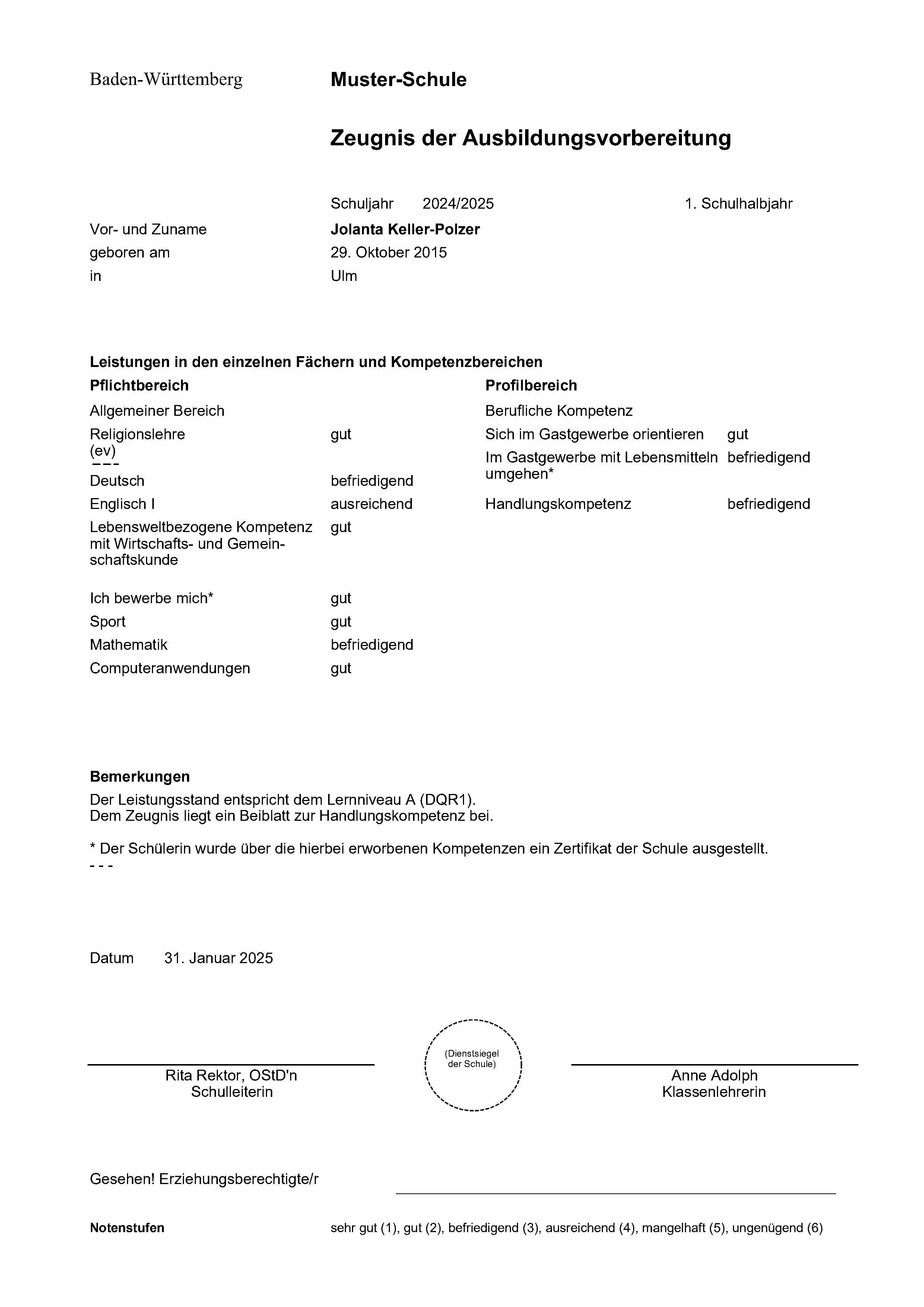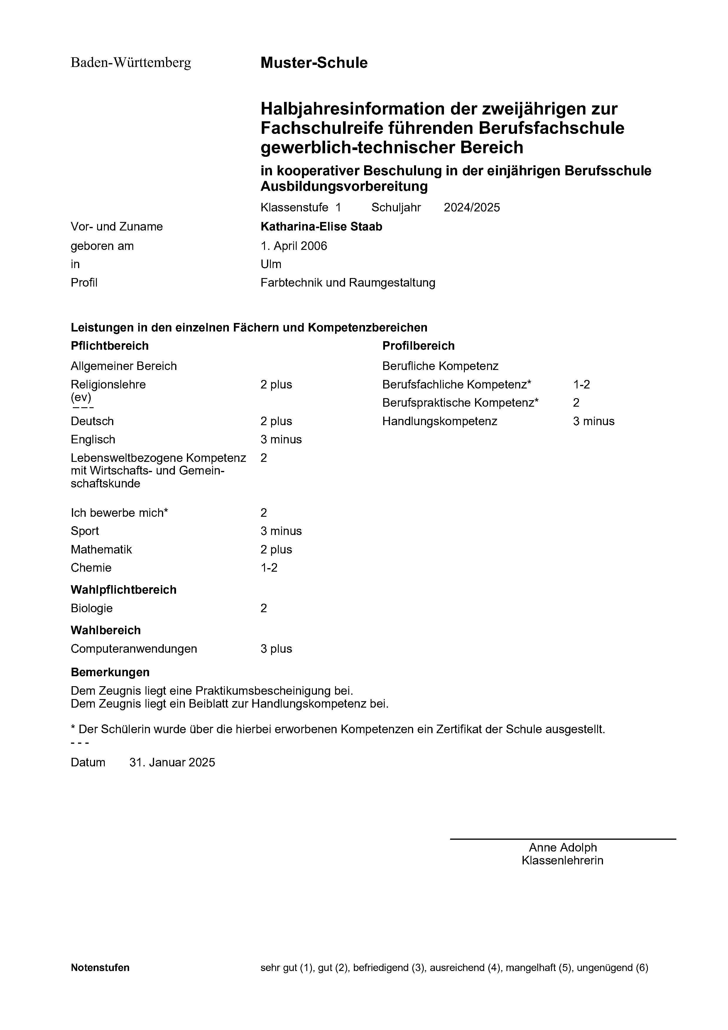 >In AV und AV Dual gibt es für Schüler, die im Niveau 2BF unterrichtet werden, kein Halbjahreszeugnis, sondern eine Halbjahresinformation.
