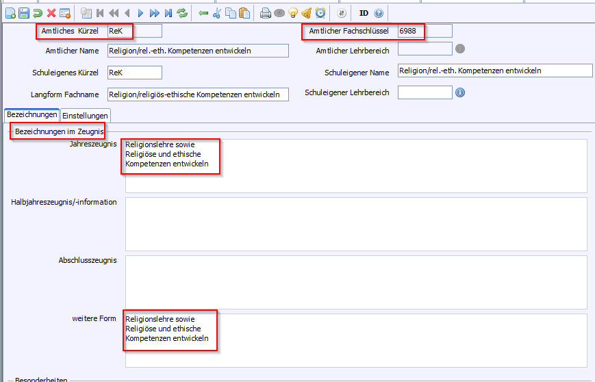 Damit das Fach ReK - Religion/rel.-eth. Kompetenzen entwickeln richtig als „Religionslehre sowie Religiöse und Ethische Kompetenzen entwickeln“ bzw. „Religiöse und Ethische Kompetenzen entwickeln“ korrekt auf dem Zeugnis ausgegeben wird, fügen Sie die Bezeichnung im Zeugnis für das Jahreszeugnis und die weitere Form ein. In der Schulstundentafel (3BFP bzw. BFPL) ersetzen Sie die Fachkategorie Reli-Et durch das Fach ReK. Hier Fach wählen, nicht Fachkategorie. |