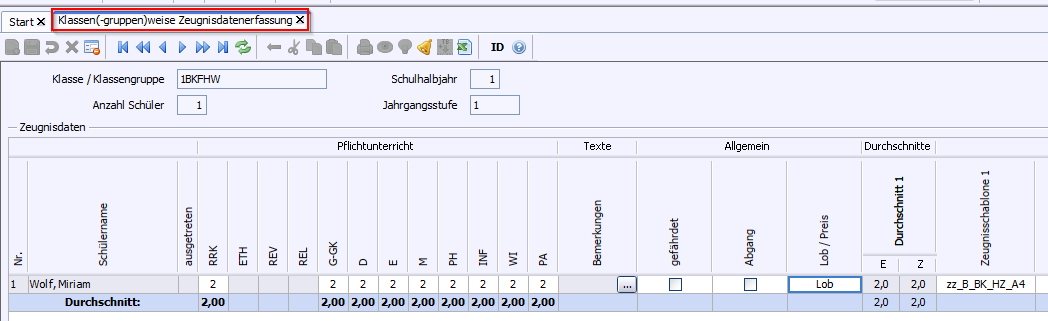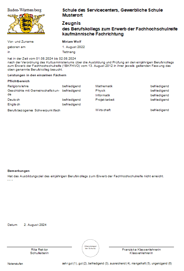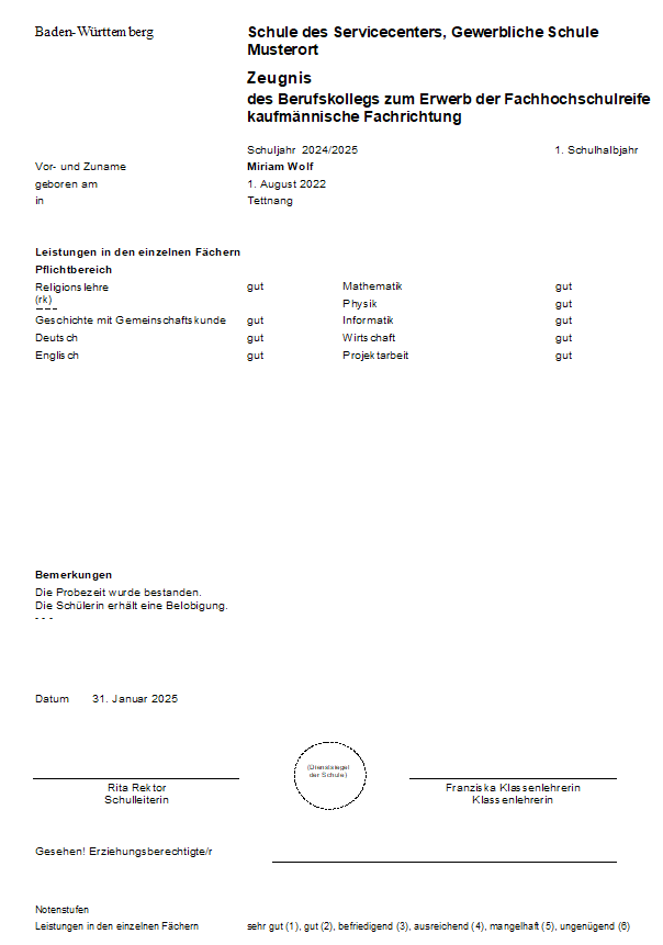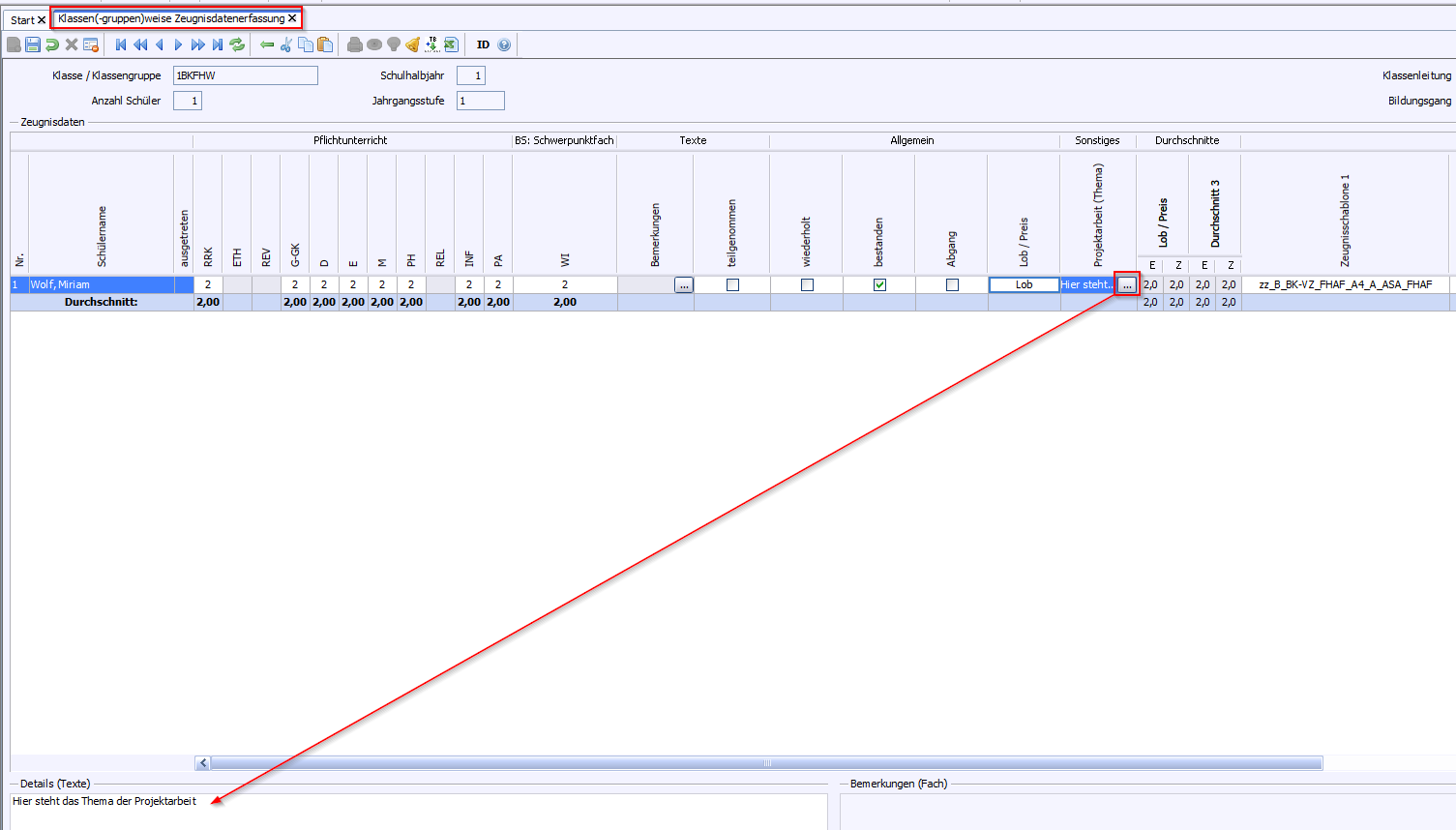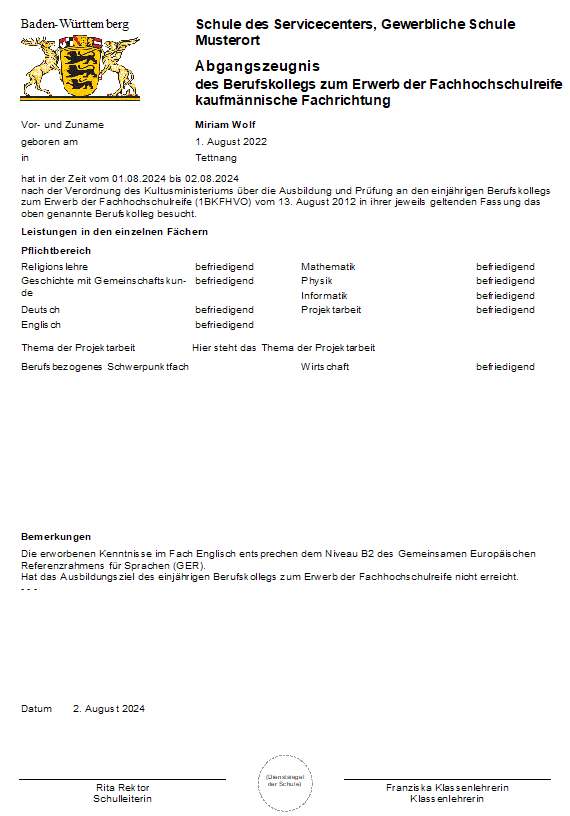 >Fügen Sie folgende Zusatzleistungen in die Zeugniskonfiguration ein: Bemerkungen, teilgenommen, wiederholt, bestanden, Abgang, Projektarbeit (Thema),Lob / Preis,Durchschnitt 1,Durchschnitt 3.