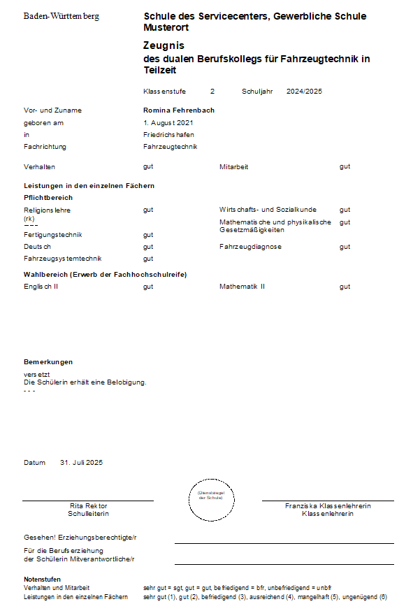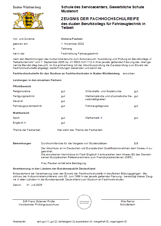 p Die unterschiedlichen Texte auf den Zeugnissen werden gemäß der in den Klassen zugewiesenen Stundentafeln erstellt. Siehe Voraussetzungen. Für die Erfassung von Einzelnoten bei zwei Abschlüssen (Assistent und Fachhochschulreife) können Sie die von uns bereitgestellten Notenblöcke verwenden. (Einstellungen Notenverwaltung) |
