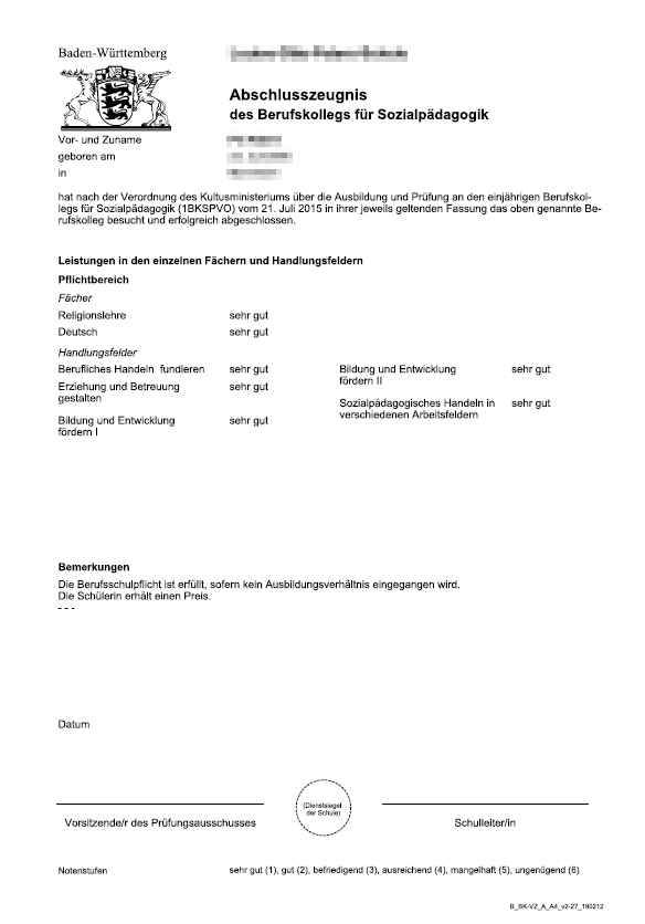Schülerinnen und Schüler in den Bildungsgängen 2BFQEE und BFSAID verbleiben in ihren jeweiligen Klassen und erhalten automatisch ein Zeugnis für Schulfremde. Ein Zeugnis der Art ASA muss dort eingerichtet sein.