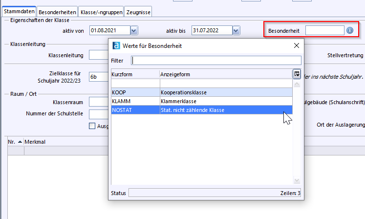 Im neuen Schuljahr wird eine Regelklasse eingerichtet mit der Abschluss-Jahrgangsstufe der schulischen Ausbildung, dem entsprechenden Bildungsgang und der oben beschriebenen Stundentafel. Der Klasse wird auf dem Reiter Stammdaten das Merkmal NOSTAT zugewiesen, damit sie statistisch nicht mitgezählt wird.