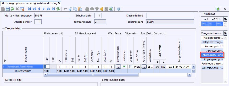 Im aktuellen Schuljahr ist in der klassengruppenweisen Zeugnisdatenerfassung zumindest die Note für die Gesamtnote des Berufspraktikums oder die Note des Kolloquiums (wenn vom Praktikum befreit) zu erfassen. Werden keine weiteren Noten eingetragen, werden diese aus dem Vorjahr zur Zeugnisart ASA entnommen.