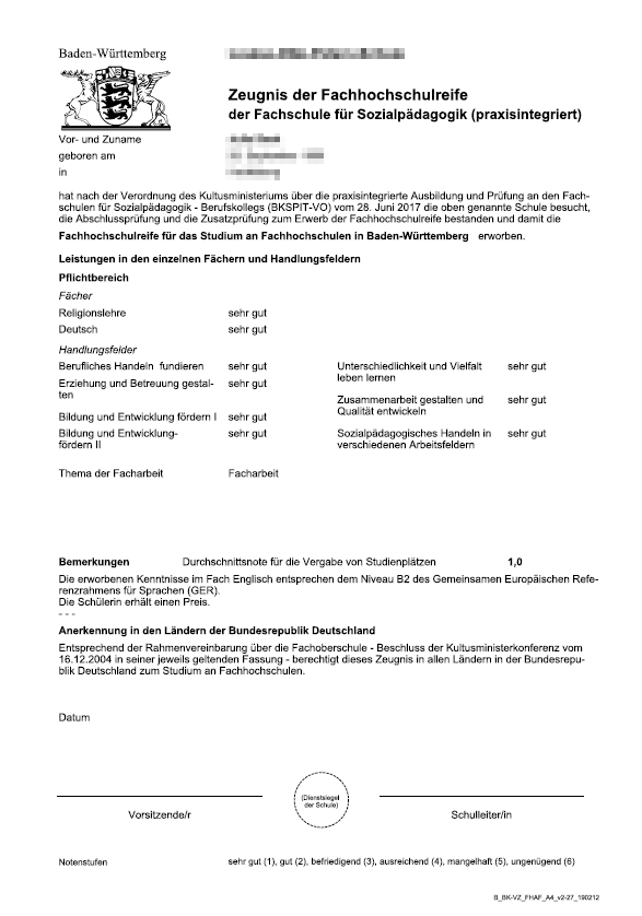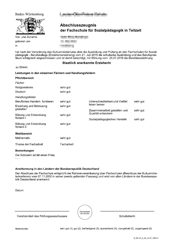 Die Schülerinnen und Schüler, die den Abschluss der schulischen Ausbildung über eine Schulfremdenprüfung absolviert haben, müssen eine erziehungspraktische Prüfung ablegen. Die Note hierfür entspricht der Leistung des Handlungsfeldes "Sozialpädagogisches Handeln" und wird dort erfasst.