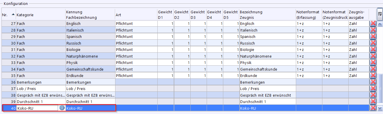 In der Spalte Kennung Fachbezeichung und in der Spalte Bezeichnung Zeugnis ist der Name der Sprache einzutragen.