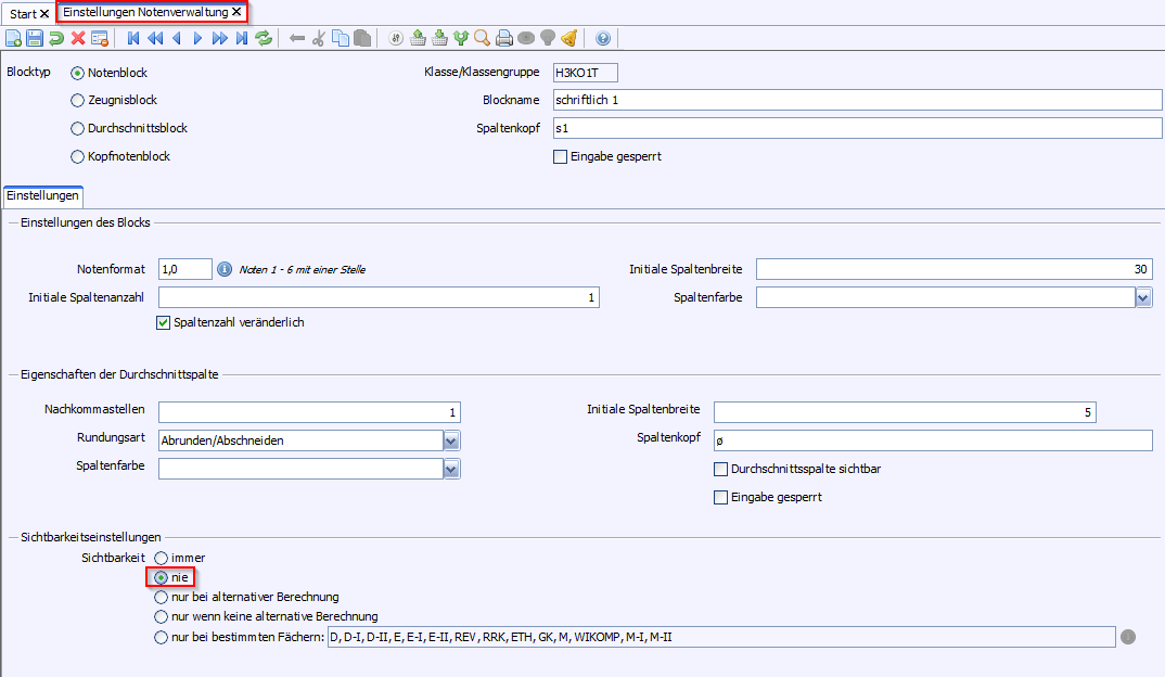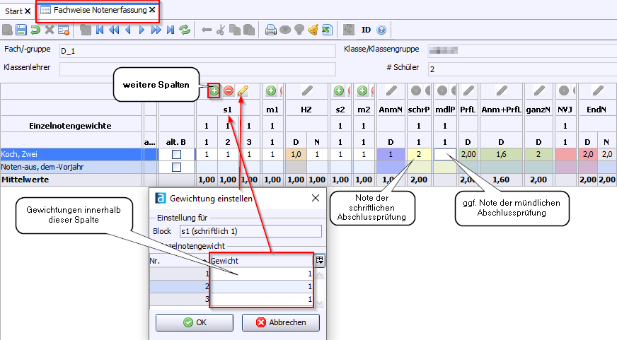 | 3 | ergänzende Noteneinstellungen; wurden bisher keine Notenblöcke importiert, aber bereits Halbjahreszeugnisnoten erfasst, können diese Noteneinstellungen trotzdem hinzugefügt werden; siehe Notenblöcke ergänzen. |