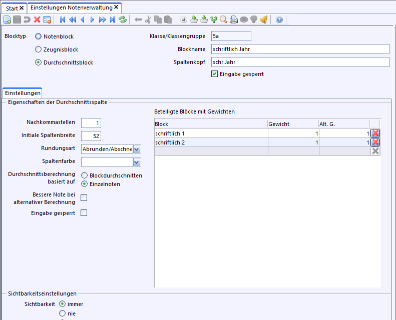 Beteiligte Notenblöcke mit Gewichtung zur Berechnung der Durchschnittsnoten z. B. für Halbjahresinformationen werden definiert.