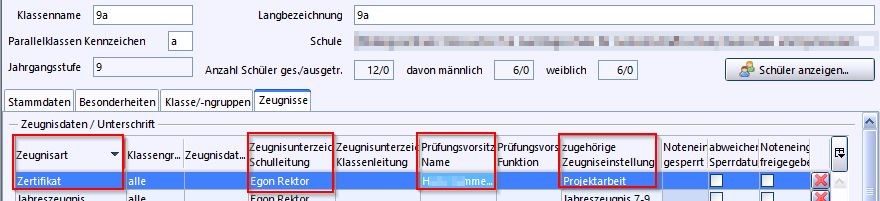 >Tragen Sie hier bei Zeugnisunterzeichner Schulleitung die Schulleitung ein und bei Prüfungsvorsitz Name die von der Schulleitung eingesetzte Leitung eines Fachausschusses. Die anderen Unterschriftsfelder werden von dieser Zeugnisschablone ignoriert.